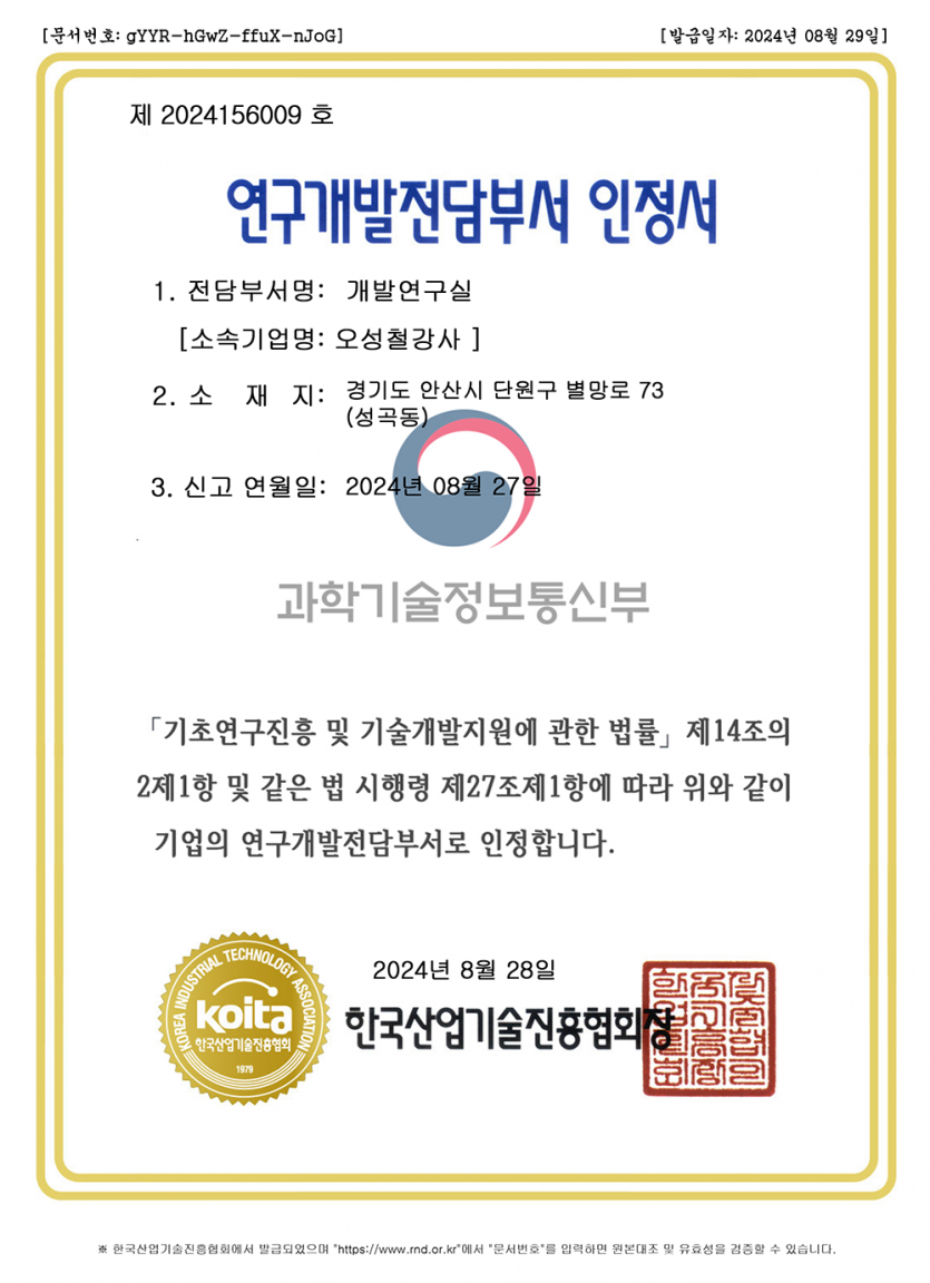 연구개발 전문부서 인증 페이지 정보 작성자 오성철강 댓글 댓글 0건 조회Hit 15회 작성일Date 25-10-21 12:49 본문 연구개발 전문부서 인증 목록 이전글여성기업 인증 25.10.21 댓글 0 댓글목록 등록된 댓글이 없습니다.